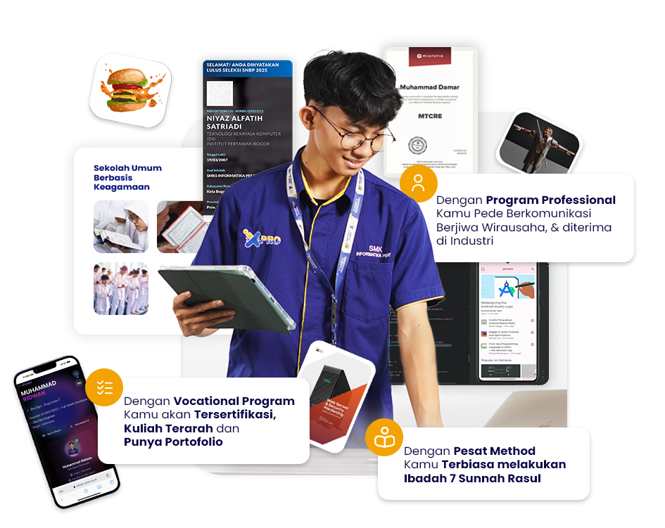 Di SMK Pesat IT XPro kami memastikan kompetensi siswa - siswi teruji dengan 3 jenis level ujian sertifikasi yang dilakukan di setiap akhir semester